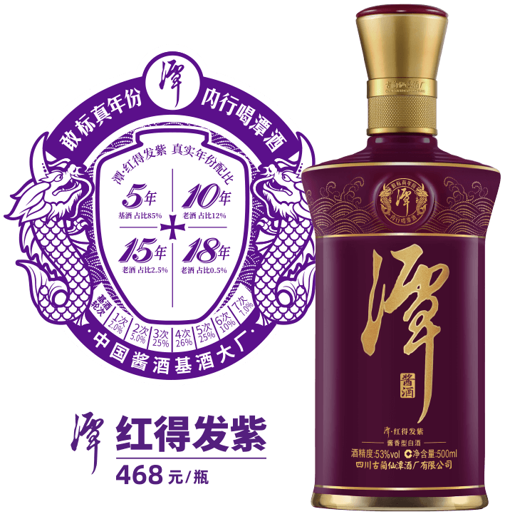 典型酱酒风格兼具诱人的芳香感,挺拔的整体香气和馥郁的口味和口感。酱香浓郁,焦香明显,兼具较突出的草本香和花香,口味较均衡,酒体丰满醇厚,余味持久。